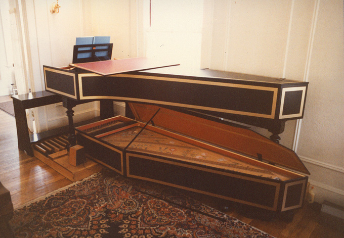 Tom also made a few instruments based not on old models but on musical fantasies: a small two-manual 17th-century style harpsichord with several unusual features (the famous “Spruce Goose”), and a pedal harpsichord (of which there are no surviving historical examples).